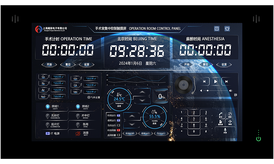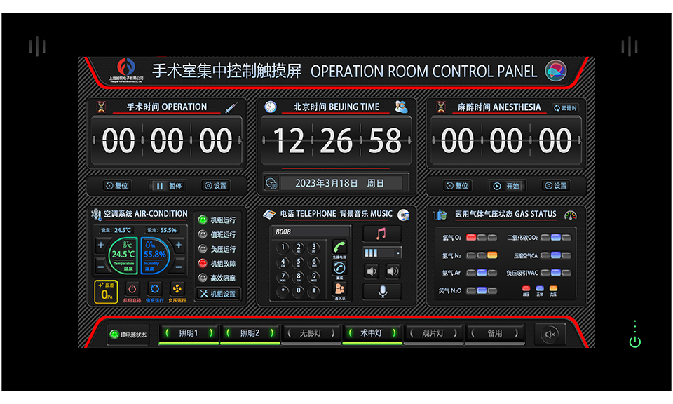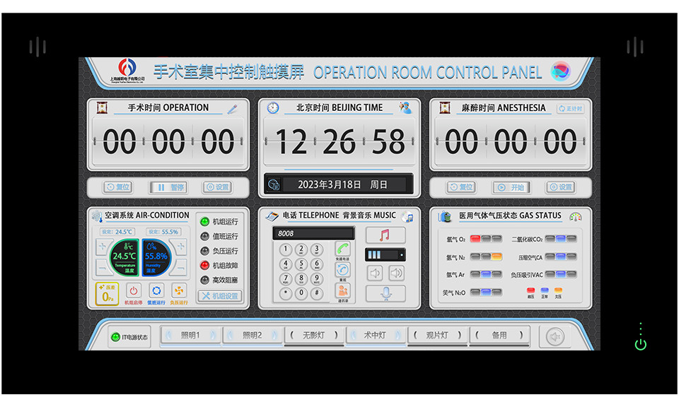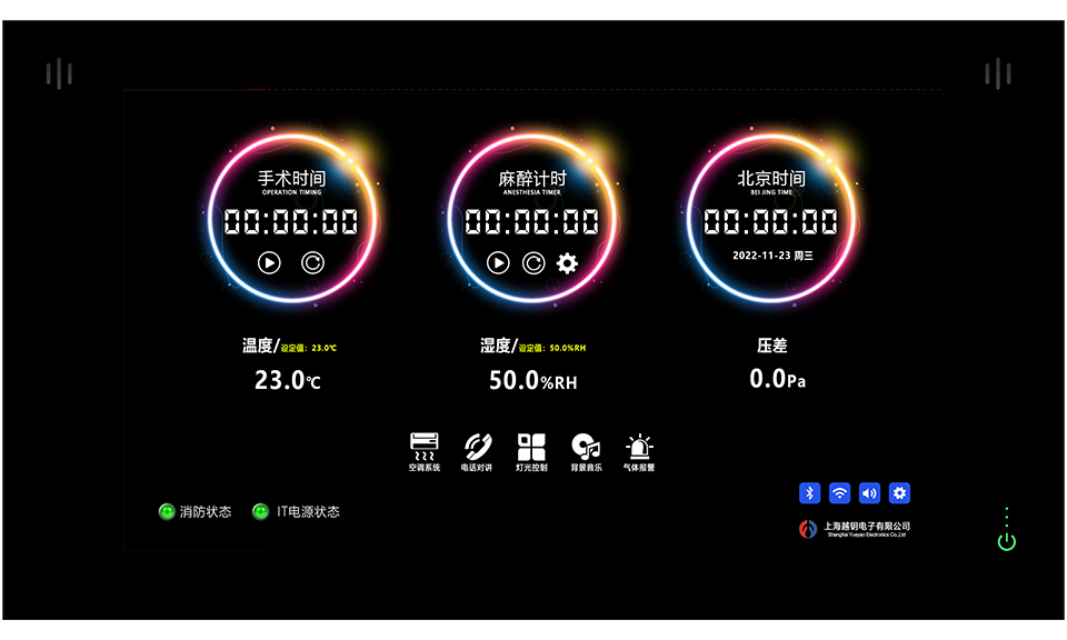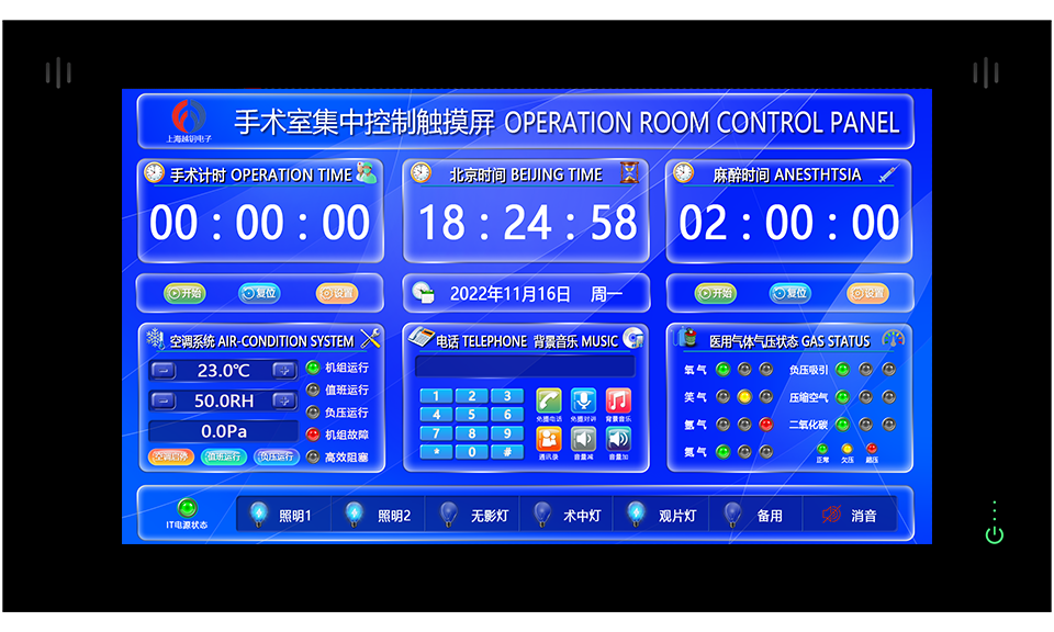 設備功能: 可定制,常規有北京時間、手術計時、麻醉計時、空調控制、氣體報警、照明控制、對講電話、背景音樂控制、RGB無極調色、隔離變壓器過流報警、漏水報警等