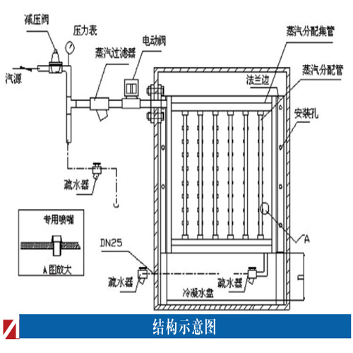 加濕原理:諾諦蒸汽快速擴散器由蒸汽分配集管、蒸汽分配支管,超大數量高密度分配噴嘴和冷凝水集管等組成,具有超高效蒸汽分布均勻度,從而提供超短蒸汽吸收距離,保證空調箱中最短的蒸汽尾跡。 接通外部飽和蒸汽源,蒸汽進人蒸汽分配集管,經內部減速裝置實現汽水的初步分離,然后進人蒸汽分配支 望 由于分配支管和蒸汽噴嘴的特殊設計,確保只捕捉干蒸汽,從而實現汽水的二次分離,干燥干蒸汽從噴嘴噴出進行加濕,冷凝水則匯集至冷凝水集管,經冷凝水管排放,